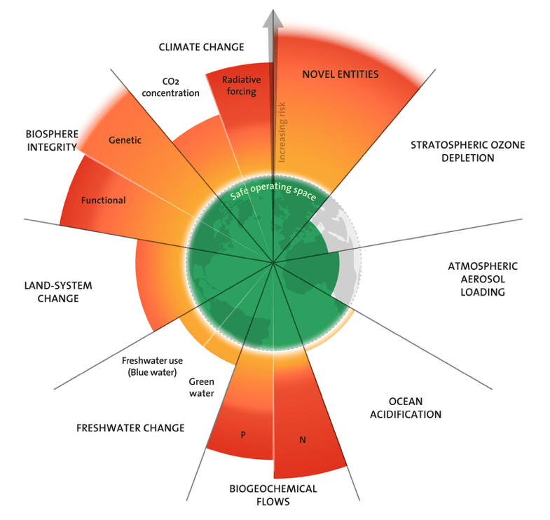 The planetary boundaries framework (developed by the Stockholm Resilience Centre) defines the safe limit of release and activity across 9 domains to keep the planet with a safe operating space aimed at preventing ecosystem degradation.